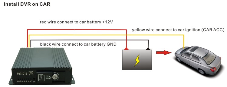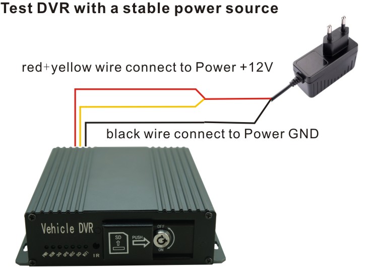1. Normally, we may test DVR in office/home with a normal power adapter, in this condition, please connect DVR power wires like below.