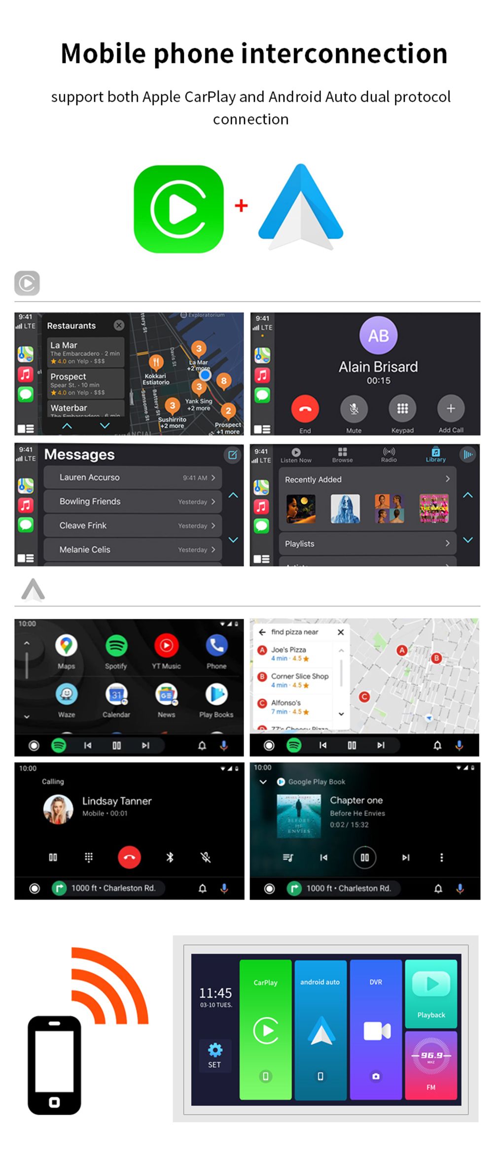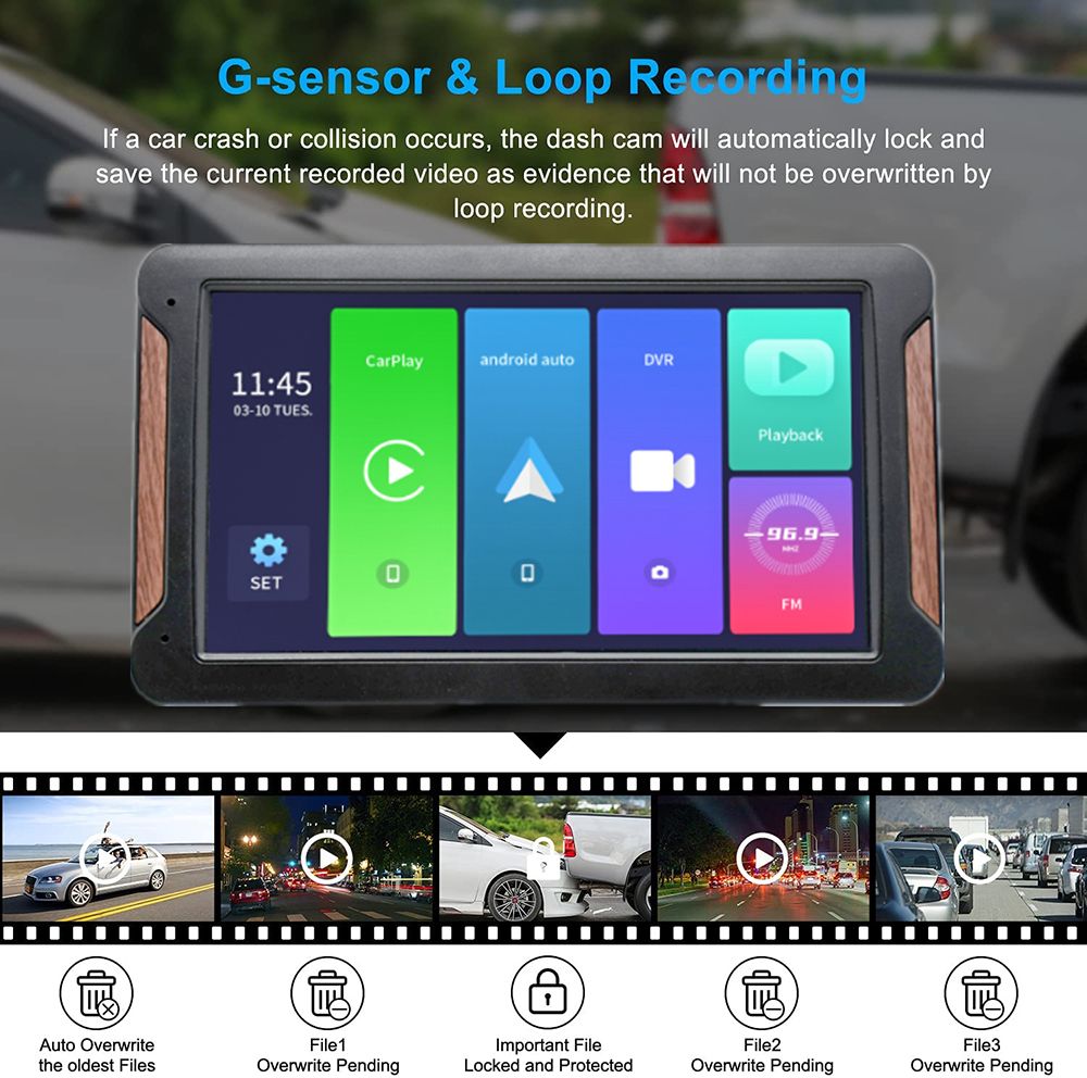 This is a 2 channel car dvr system which support Car Play and Android Auto. All smart phone App could sync. to this monitor and operation on screen. One camera at back side of monitor, another extended, both 1080P.