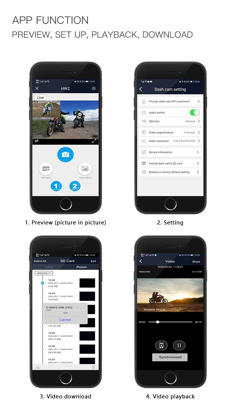 This is a 2CH 1080P FHD Car DVR has WIFI for APP operation. Build in G-Sensor, external GPS optional. Novatek NT96663 with HD LVDS camera signal. It is widely used in Taxi, truck, transport vehicles case for commercial.