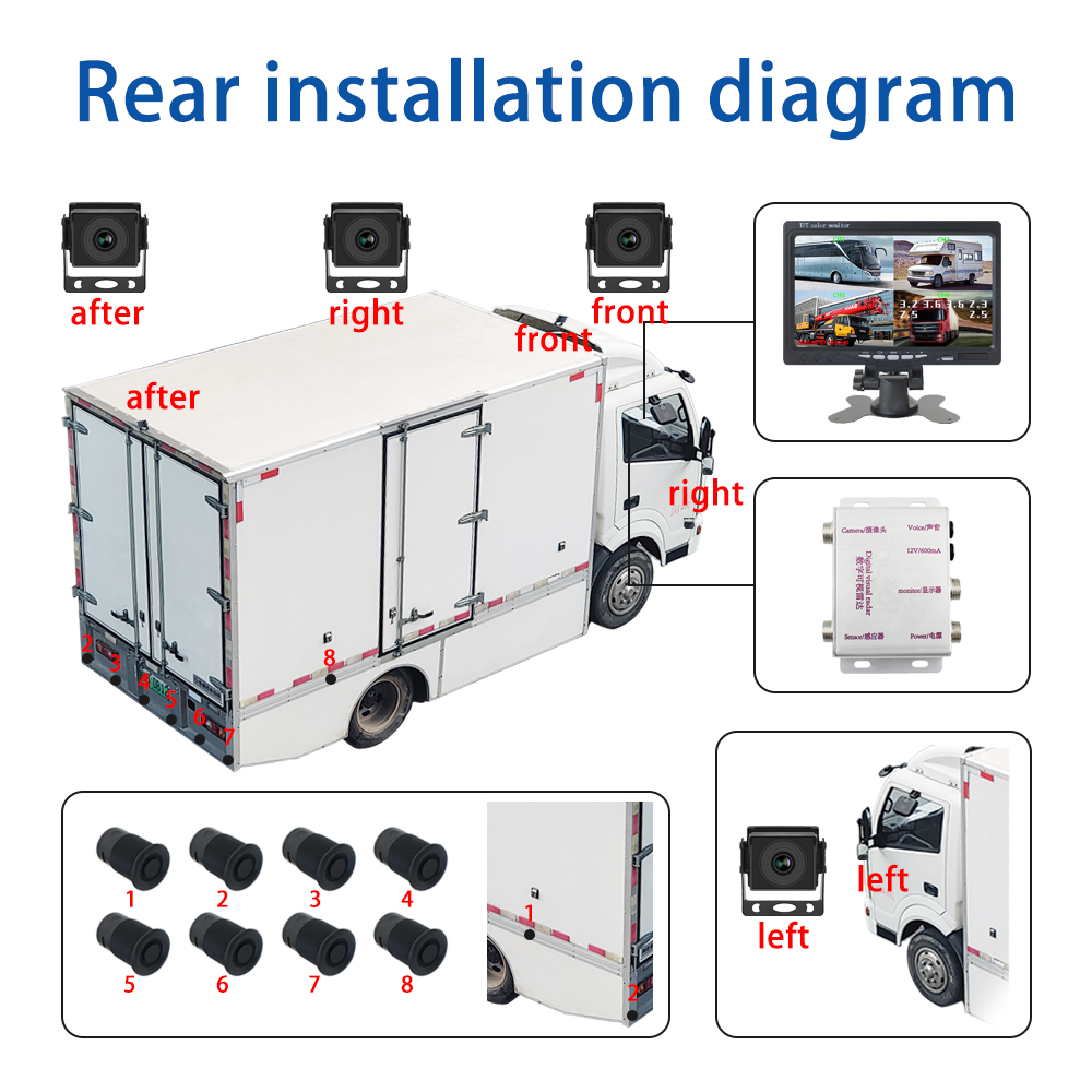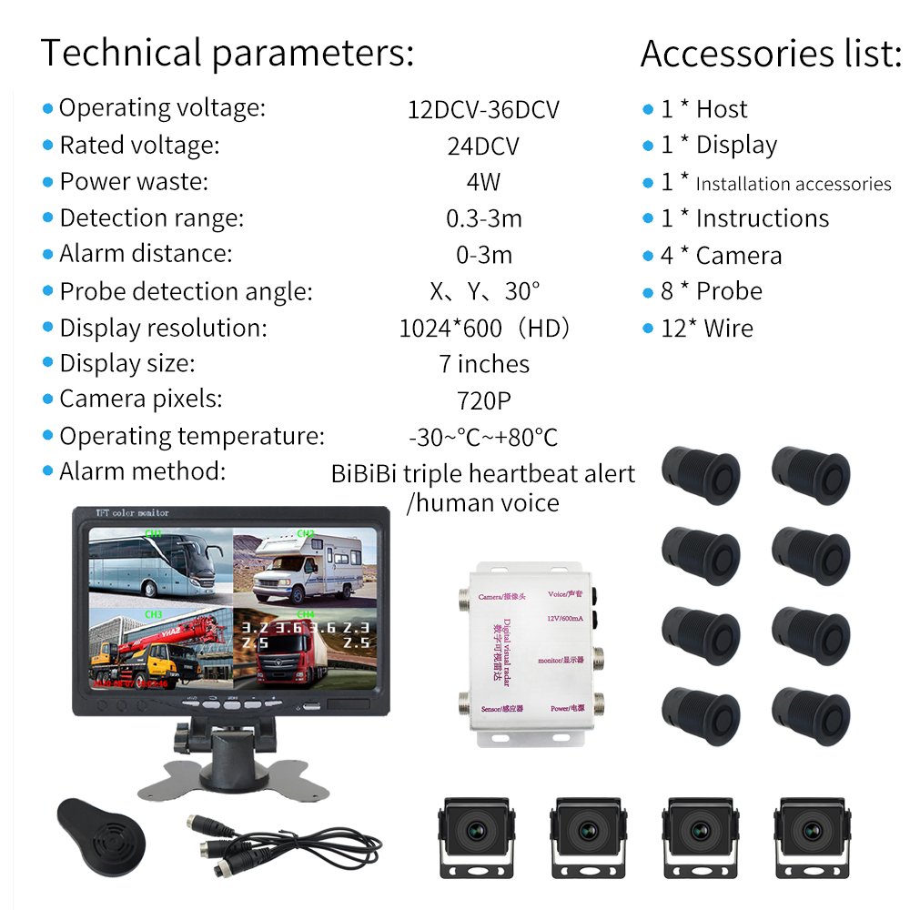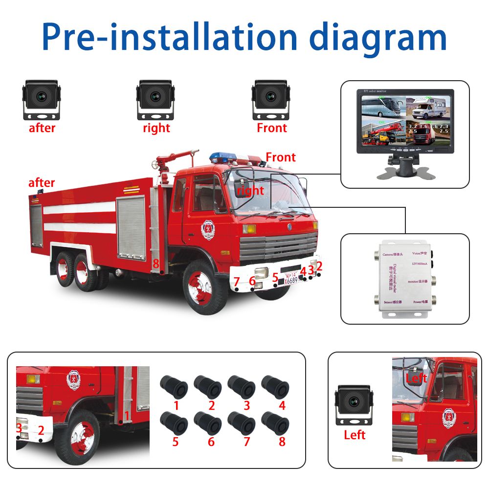 It's a radar video system designed for big truck. it's support 4 or 8 radar detector for driving assistant, and also has 4 AHD cameras for video capturing and recording.