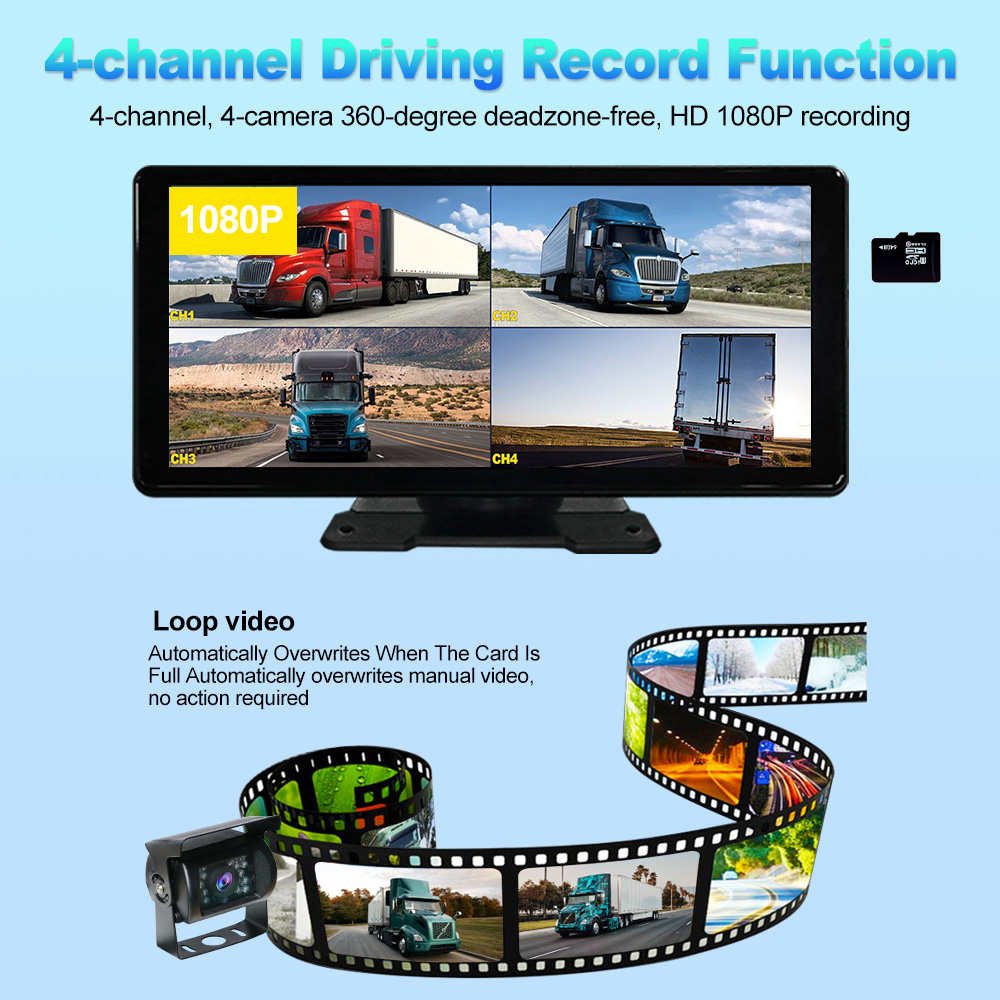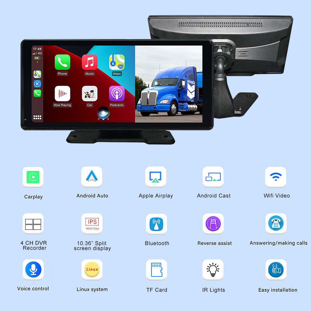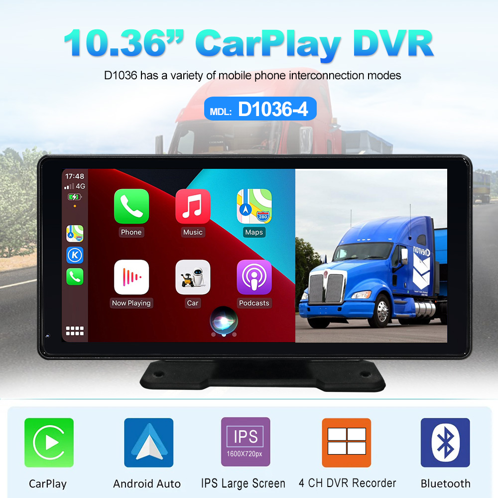 It is a 10.36 inch monitor DVR which support CarPlay and Android Auto. Full screen touch control and also support voice control. 4 cameras recording, wifi preview and download recorded files.
