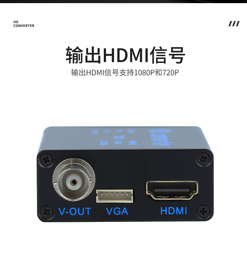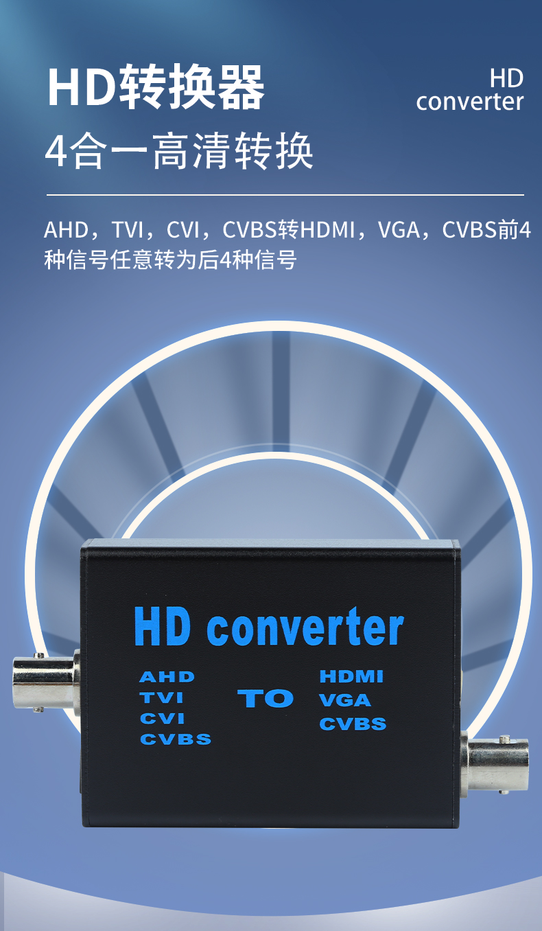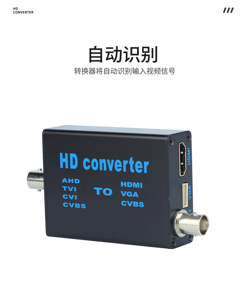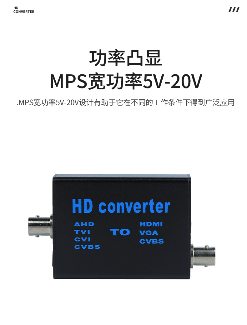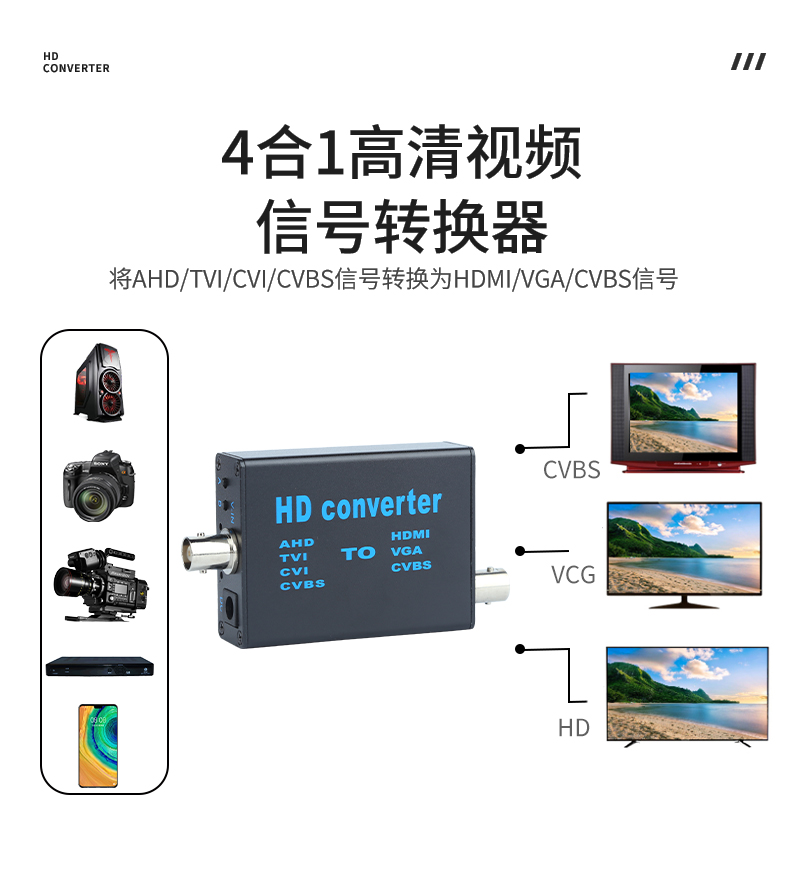 本产品是一款4合1高清视频转换设备,将AHD/TVI/CVI/CVBS等信号转换为HDMI/VGA/CVBS输出;信号输入端自动识别各种信号,完美兼容1080P,960P,720P,480P等同轴高清信号输出HDMI支持1080P,720P;设备提供按键,可以做视频输出切换显示,采用MPS宽电源5-20V设计,支持各种场合应用。