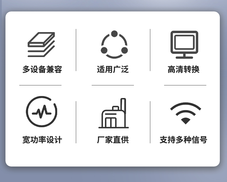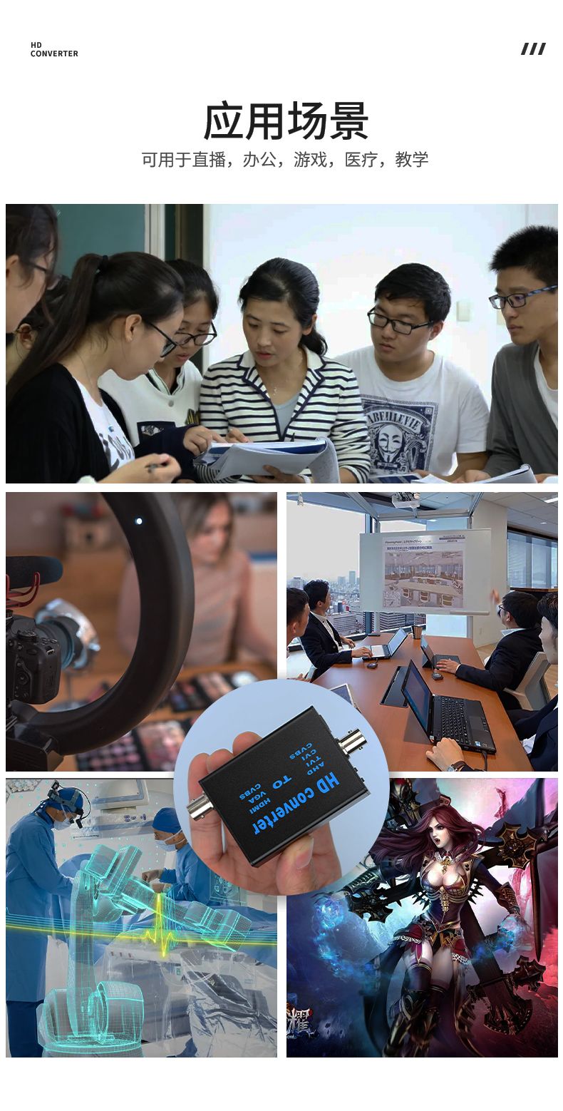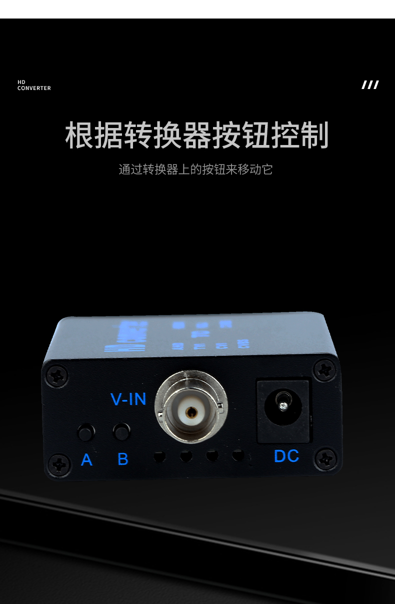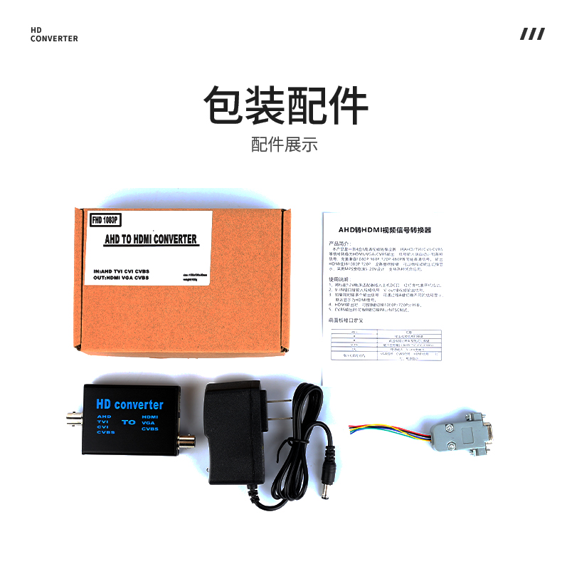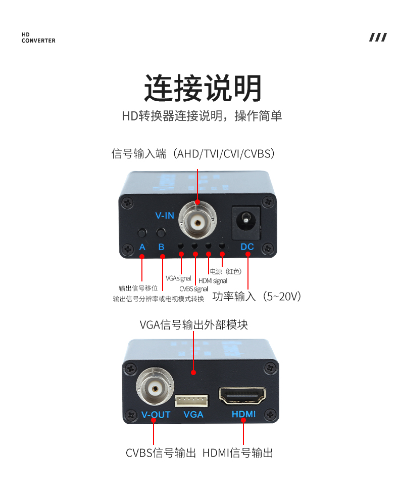 本产品是一款4合1高清视频转换设备,将AHD/TVI/CVI/CVBS等信号转换为HDMI/VGA/CVBS输出;信号输入端自动识别各种信号,完美兼容1080P,960P,720P,480P等同轴高清信号输出HDMI支持1080P,720P;设备提供按键,可以做视频输出切换显示,采用MPS宽电源5-20V设计,支持各种场合应用。