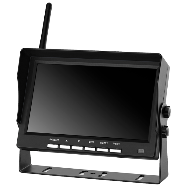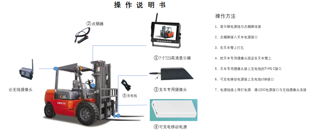 这是一款专门为叉车定制的监控录像系统。全系统为无线工作,摄像机与屏幕之间是2.4G无线频率连接。一个屏幕可以最多与4个无线摄像机同时工作。叉车摄像机为特殊形状,专门为叉车臂量身定制,通过钻孔的方式固定在叉车臂上,通过外解一个5V移动电源供电。屏幕自带SD卡录像功能。可以将叉车工作过程记录下来。