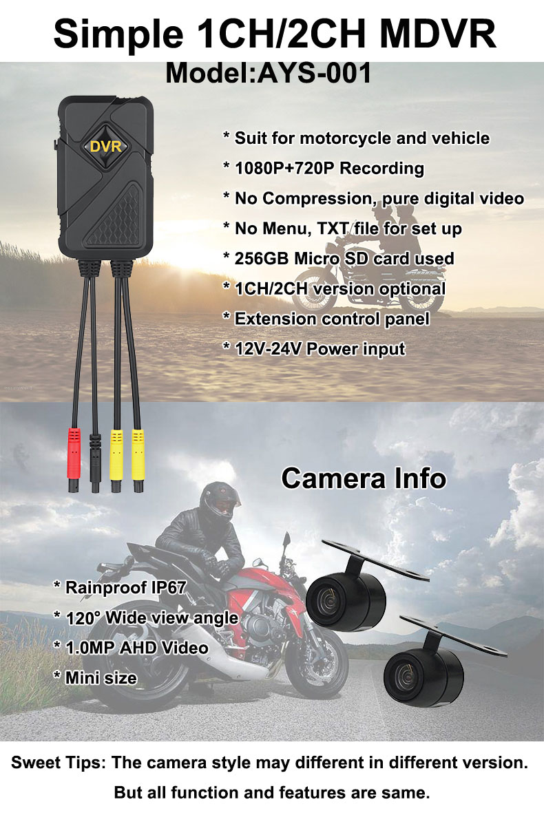 Low cost 2CH HD Motorcycle DVR Camera Kit Model AYS-001-2