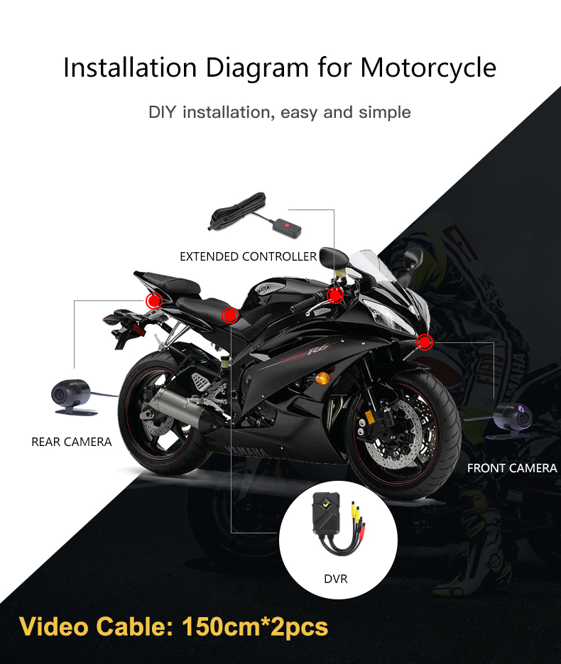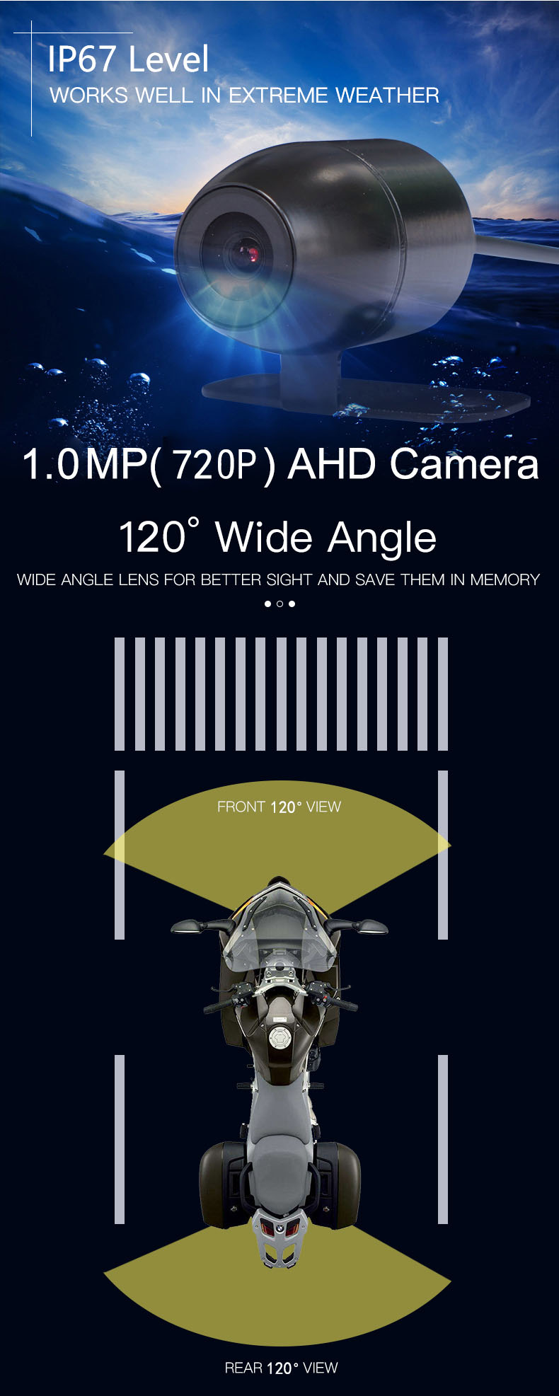 This is a low cost 2 channel 1080p+720p hd motorcycle DVR. Support Max. 256GB Micro sd card. Auto recording with motorcycle start.