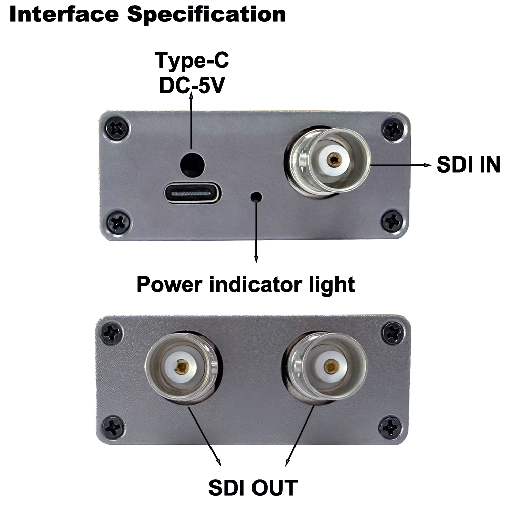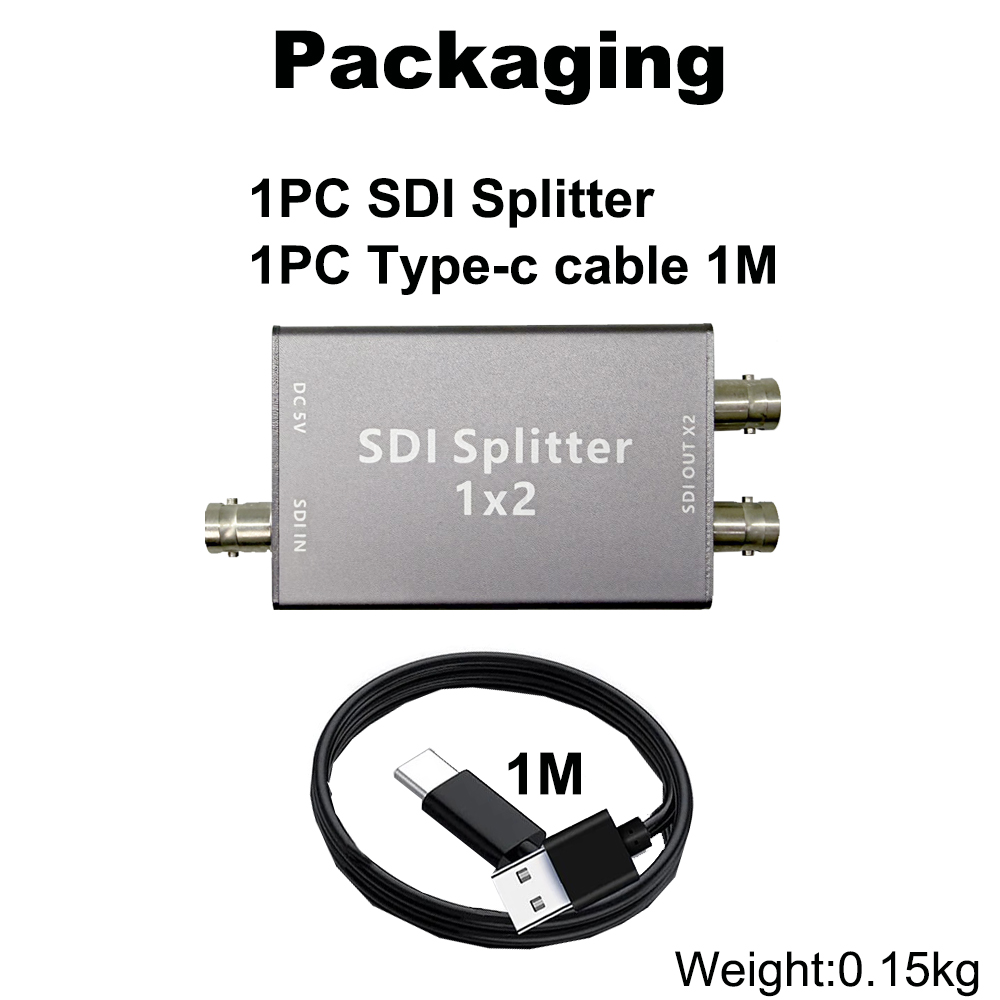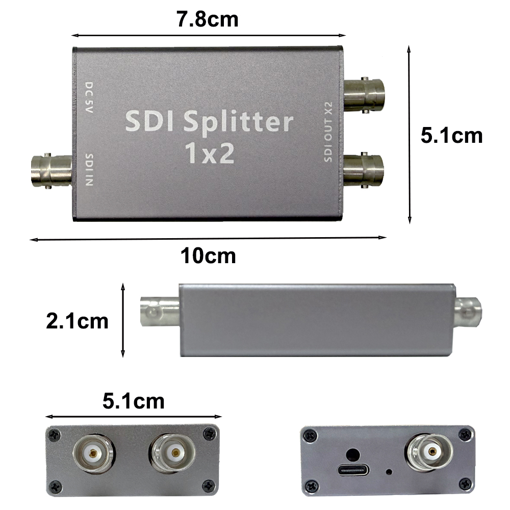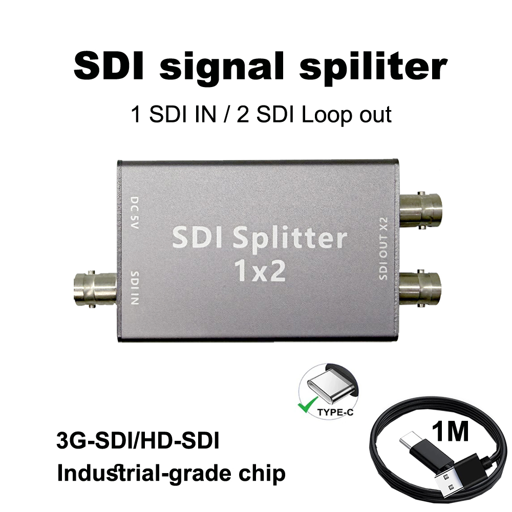 It is an industrial-grade SDI signal spiliter. 1 SDI signal input, and 2 same SDI signal loop out. It support 3G-SDI and HD-SDI input. 5V power in from USB-C.